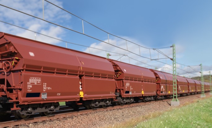 Die bereits im Jahr 2021 erschienenen Selbstentladewagen werden mit neuen Betriebsnummern erneut aufgelegt. Damit lassen sich zusammen mit den früheren Wagen und den TRIX-Modellen vorbildgerechte 12-Wagen-Züge für eine 1189er-Doppeltraktion bilden.